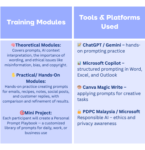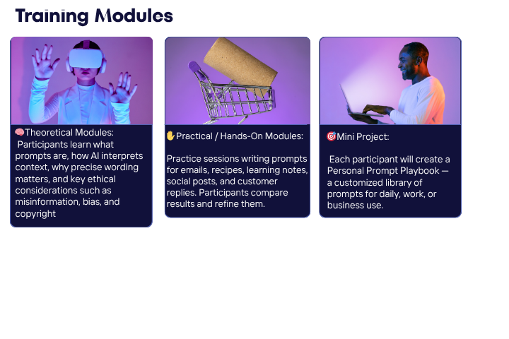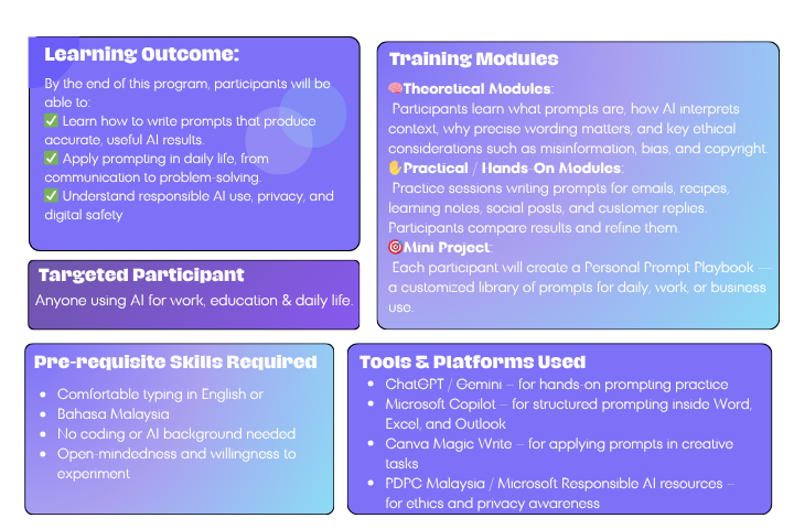 Each participant will create a Personal Prompt Playbook — a customized library of prompts for daily, work, or business use.